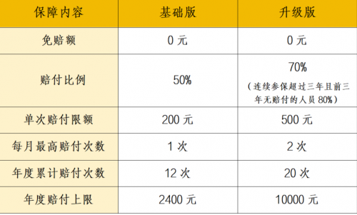 基础版与升级版双轨并行,采用0免赔额设计。其中升级版对连续参保者最高提供80%赔付比例,单次限额500元配合年度万元封顶,叠加药品补贴券后,部分慢性病患者可实现近乎0元用药。